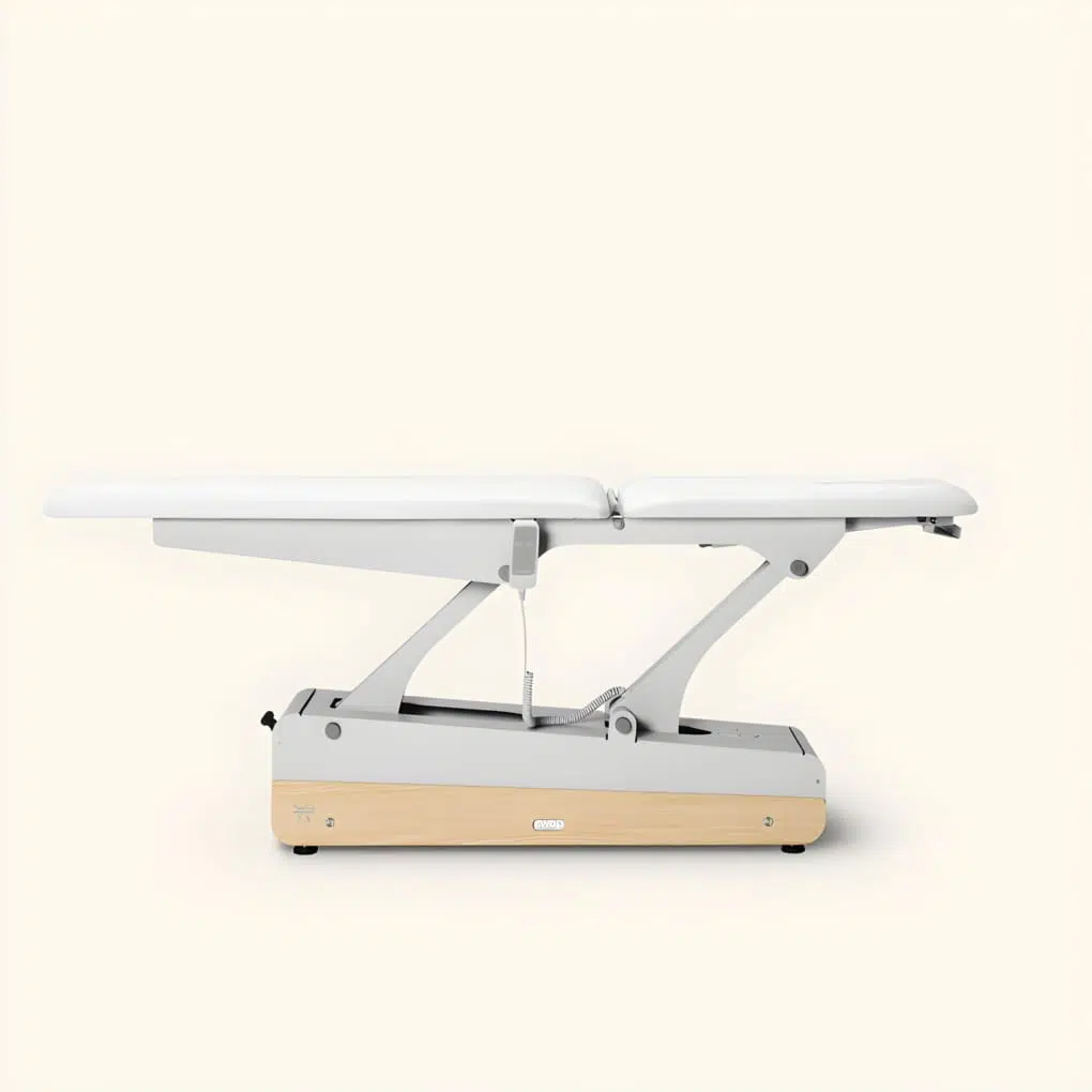 De wielen zijn onzichtbaar ingebouwd en worden centraal bediend vanuit 2 korte zijden van de bank. Zo verplaats je jouw behandeltafel eenvoudig!