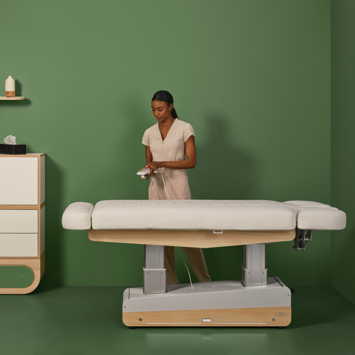 De SWOP S4 UP Grand Relax is een exclusieve spa-, wellness- of haptonomietafel met een zacht en supercomfortabel matras met Naggura Soft Skin. De tafel heeft 2 apart instelbare hefzuilen voor de hoogte. Het matras is uitgerust met Twinlift® armsteunen en is voorzien van verwarming met auto-off functie na 2 uur. 4 motoren voor verstelling van hoogte, rugdeel en uitschuifbaar voetdeel en een geheugen voor 3 posities. Uniek design met verwisselbare paneeltjes in diverse kleuren en materialen (oak meegeleverd).