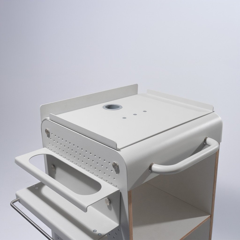 Slim ontworpen om de bedrading van de apparaten door de trolley te voeren en om een netsnoer op te rollen. Volledig uit gelakt staal en multiplex met een melamine laag.