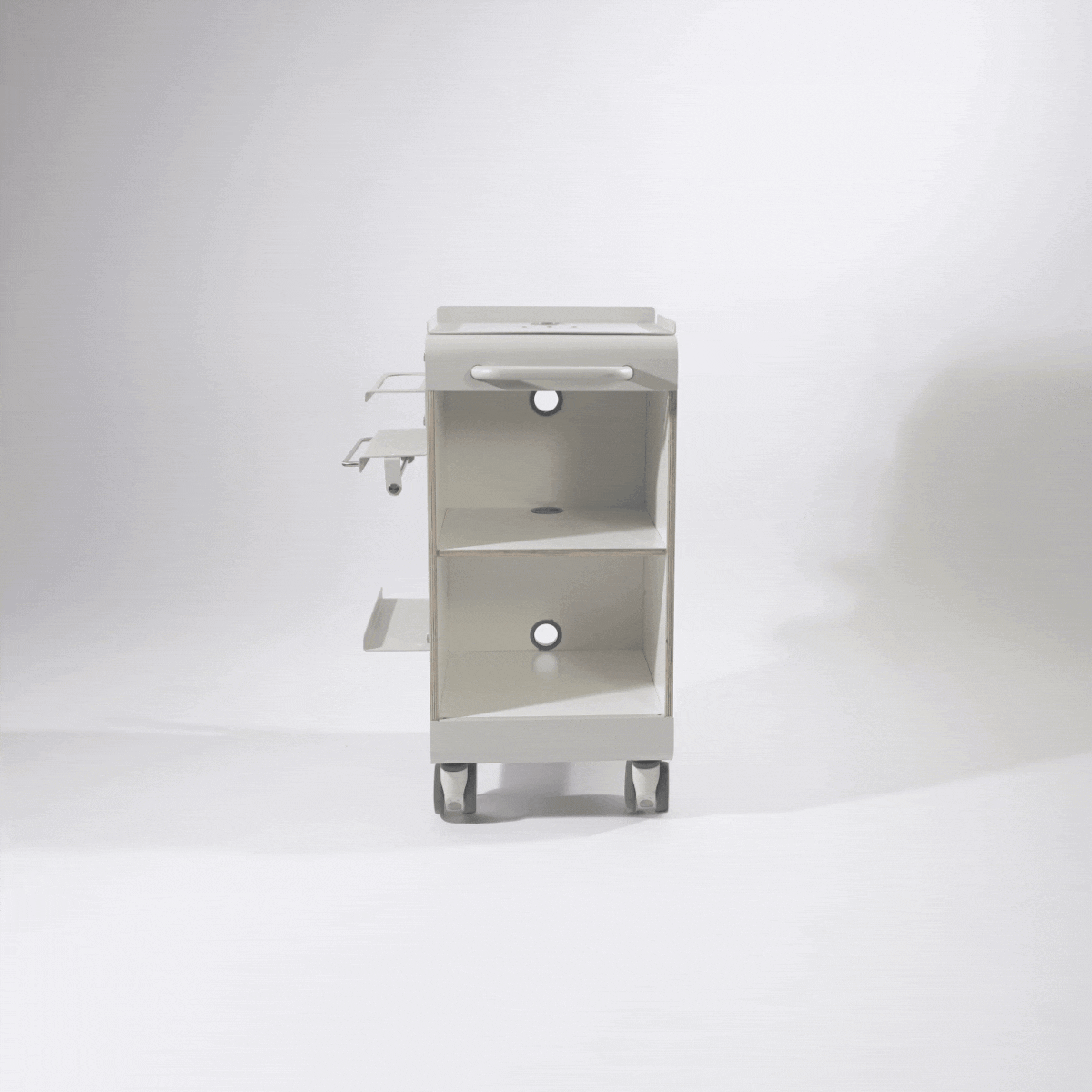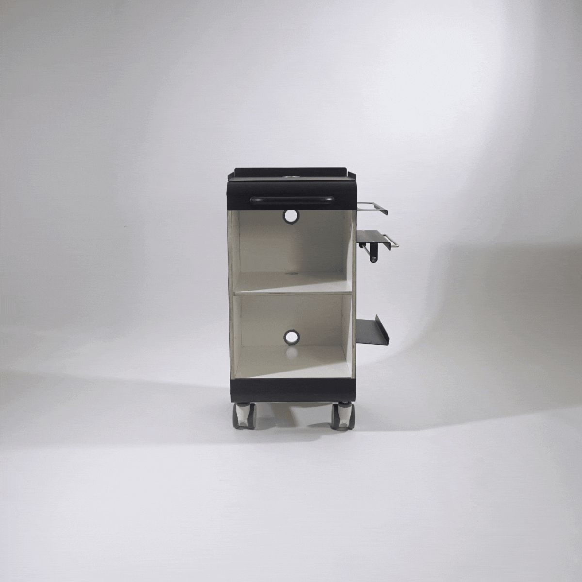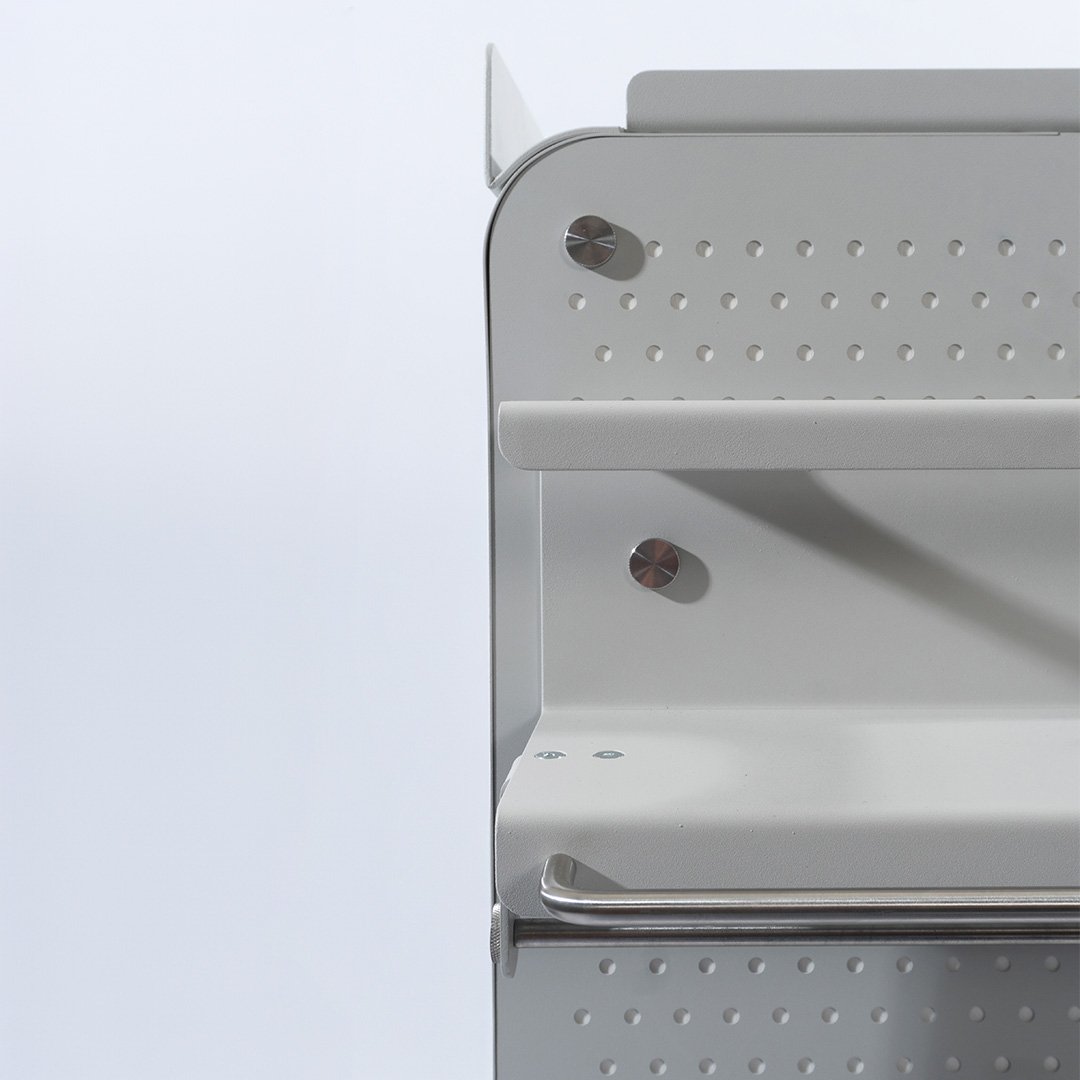 Prachtige ultra-stevige trolley, te gebruiken als een bijzettafel of voor het plaatsen van apparatuur en accessoires in jouw behandelkamer. Gemakkelijk te verplaatsen dankzij robuuste 90mm wielen die 360º draaien en een handgreep aan de voor- of achterkant. Royale opbergruimte en mooi afgewerkte zijdes met geperforeerde metalen panelen.