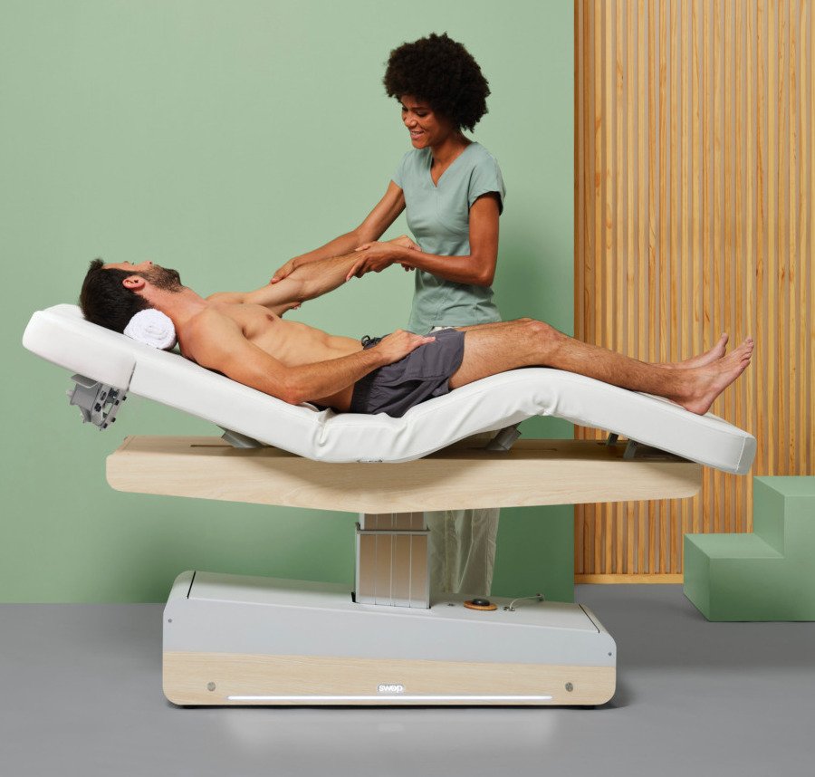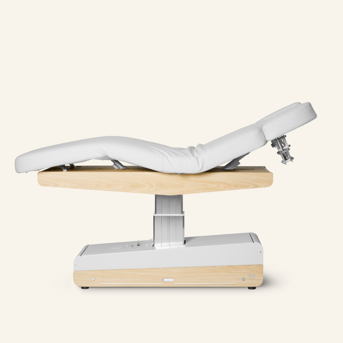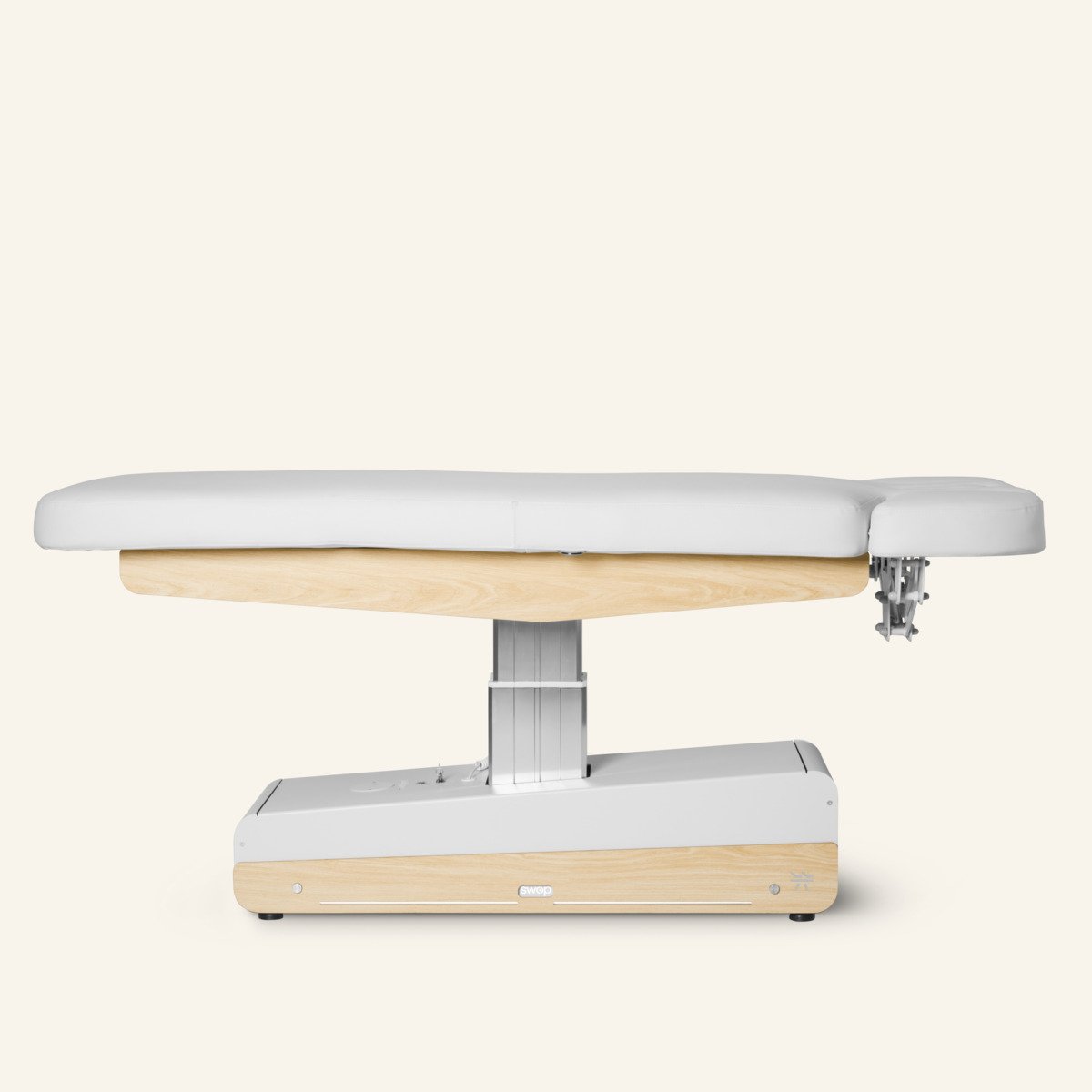 De SWOP S3 PRO is een allround spa-, wellness- of haptonomietafel met een comfortabel dik matras. Het matras is uitgerust met Twinlift® armsteunen en is voorzien van kussenverwarming. 3 motoren voor verstelling van hoogte, rugdeel en voetdeel door middel van een handschakelaar. Uniek design met verwisselbare paneeltjes in diverse kleuren en materialen (oak meegeleverd).