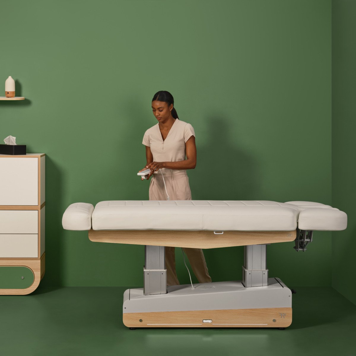 De SWOP S4 UP is een exclusieve spa-, wellness- of haptonomietafel met 2 apart instelbare hefzuilen, dik matras, Twinlift armsteunen en kussenverwarming. 4 motoren en geheugenfunctie. Wit of beige.